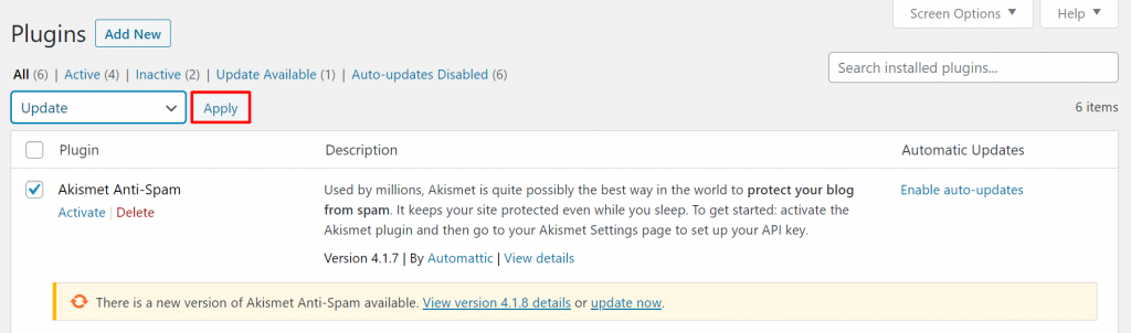 - Pentru a actualiza manual mai multe pluginuri, selectați pluginurile pe care doriți să le actualizați bifând casetele de selectare respective. Apoi, selectați Actualizare din meniul derulant Acțiuni în bloc și faceți clic pe Aplicare .