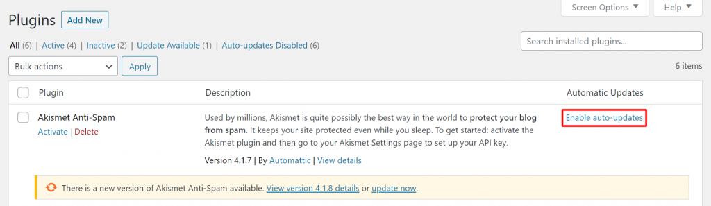 - Pentru a comuta actualizările automate, faceți clic pe Activați actualizările automate în coloana Actualizări automate pentru fiecare plugin.